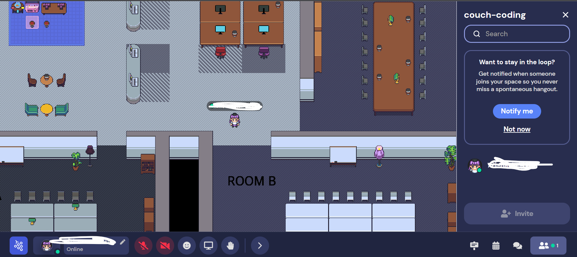 위 사진과 같이 게더타운이라는 가상공간에 수강생들이 모여 수업을 듣는방식이 색달랐다.